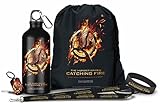 Catching Fire Movie VIP Collector Pack includes branded aluminium bottle, keychain, lanyard, and silicone bracelet all packaged inside of a Catching Fire branded drawstring backpack.
